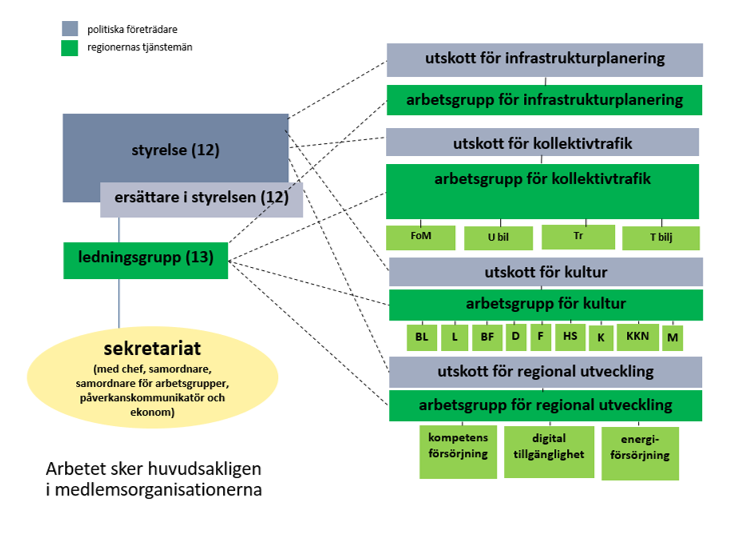 I utskott och arbetsgrupper deltar minst en ledamot från varje region som i hemmaorganisationen har ledande ansvar för sakområdet. Ordförande för utskott och sammankallande för arbetsgrupperna kommer från olika medlemsorganisationer som ett sätt att utveckla och spegla hela Sydsverige.